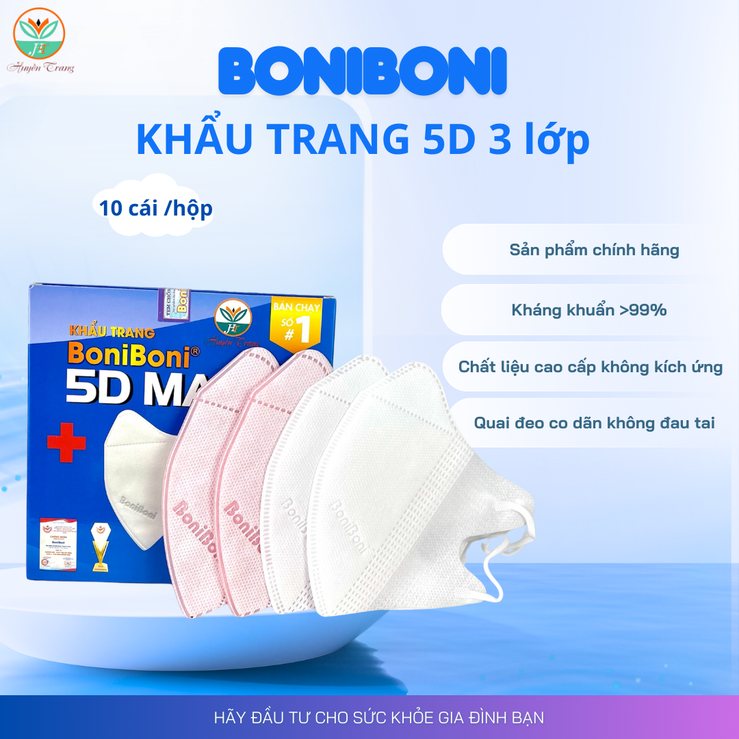 Khẩu Trang 5D Kháng Khuẩn Ngăn Bụi BoniBoni (Combo 10 hộp 100 chiếc)